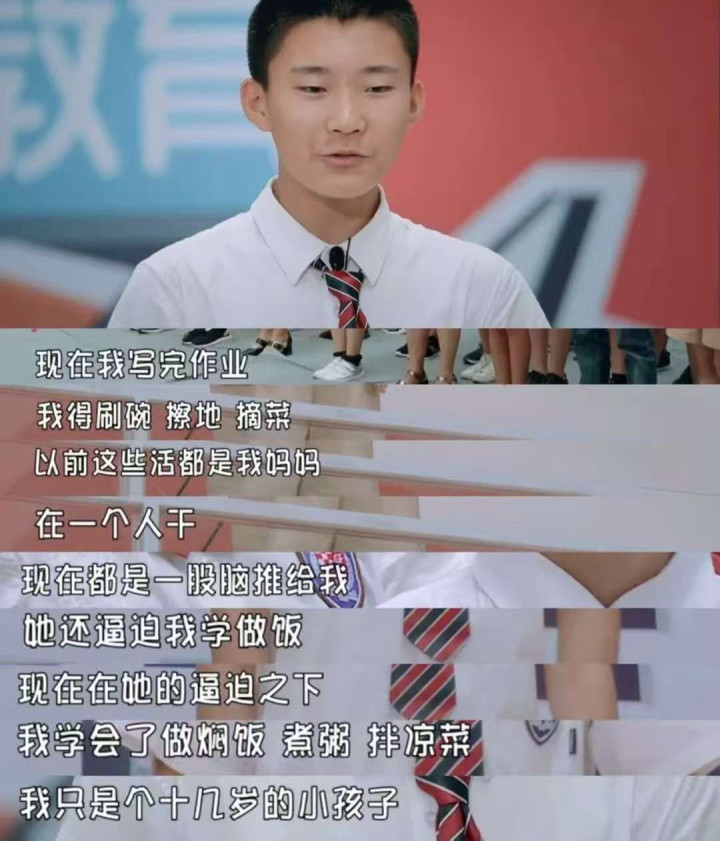 但是《少年说》这档节目中有个叫付轩昂的初中生,他在节目中说到自己每天不仅要写作业,回来还要刷碗、擦地、摘菜,妈妈还逼着他做饭。在妈妈的逼迫下他学会了做各种饭菜,他在节目中喊话“妈妈,以后能不能不要再逼我做家务?”